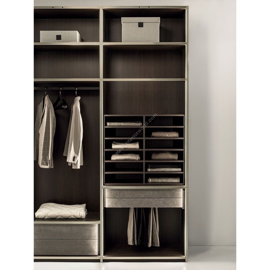 Wardrobe and walk-in closet systems with highly versatile modular design to fit into any type of space. The Atelier system proposes advanced wardrobe interior organisation featuring a broad range of accessories. Cut to measure for perfect adaptability. Blockboard structure with 25 mm MDF veneer in the wood finishes: Dark matt tinted Zebrano, matt Canaletto walnut. Front edges of modules and door profiles feature anodized aluminium finishes, as follows:- Matt Platinum- Matt satin bronze- Bright Aluminium- Bright Gold- Bright Champagne Gold- Bright dark brown electrocolour. The shelves are in dark matt tinted Zebrano wood, matt Canaletto walnut, covered in P.3 Cat. Suede or Tecsuede, or in natural, bronzed, or smoky 8 mm glass. The wood or covered shelves also come in a pull-out version. Drawer fronts are covered in P.3 Cat. Suede or Tecsuede leather. Drawer bottoms can be in wood or lined in P.3 Cat. Suede or Tecsuede leather. The side panels have LED lighting over their entire height. The back panel’s internal side can be matt lacquered ivory colour. The system includes a special 130 cm panel, which can be custom-designed into make-up corner, writing desk or TV compartment with bronze or smoky glass dividers in the shelf space. NOTE_the side panel includes an adjustable foot.