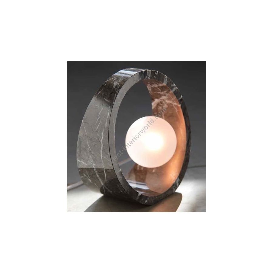 MARMOR: Tischlampe aus schwarzem Carnico-Marmor und gefrorenem Glas. Beleuchtungselement, das das Licht mit großer Wirkung in die Umgebung streut und eine warme und einladende Atmosphäre schafft.