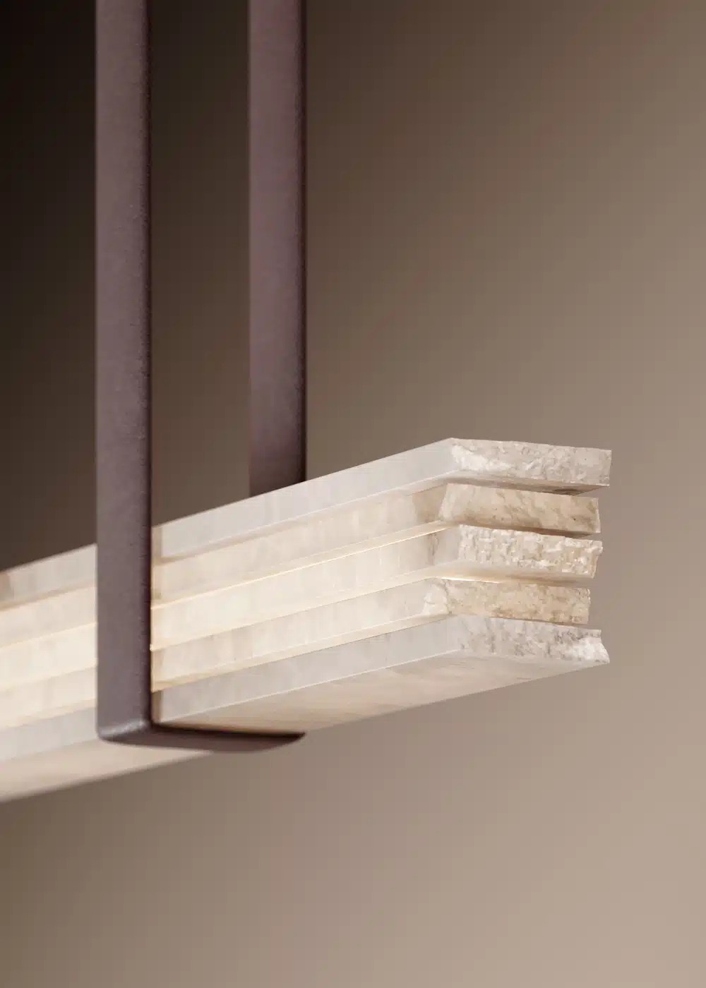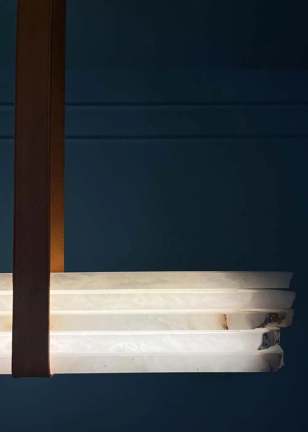 “Veleathri” takes its name from the ancient name of Volterra, one of the most important historical sites for alabaster extraction. This lamp is a tribute to alabaster, celebrated in its most authentic form, with raw finishes that highlight its natural, primitive beauty. The addition of refined leather details completes the design, creating an elegant contrast between the roughness of the alabaster and the softness of the leather. “Veleathri” is a piece that embodies the essence of the raw material, offering a balance between naturalness and refinement, a unique design element steeped in history.