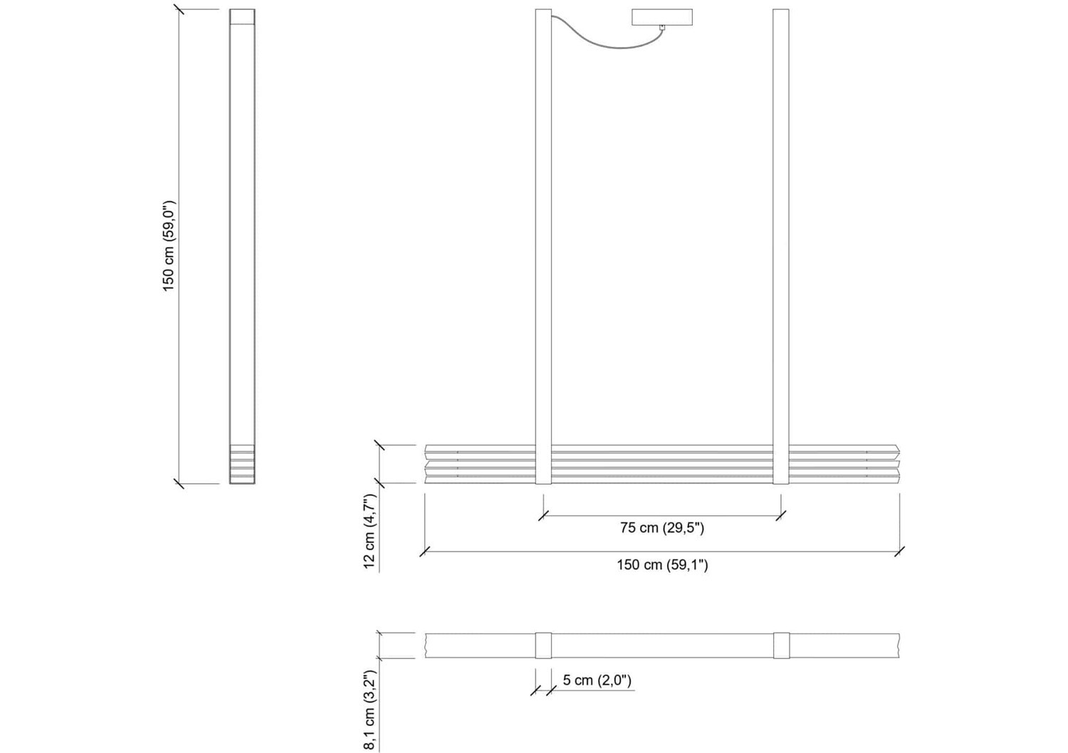 | Dimensions (HxWxD) | cm: 150x8.1 / inch: 59.06""x3.19"" |