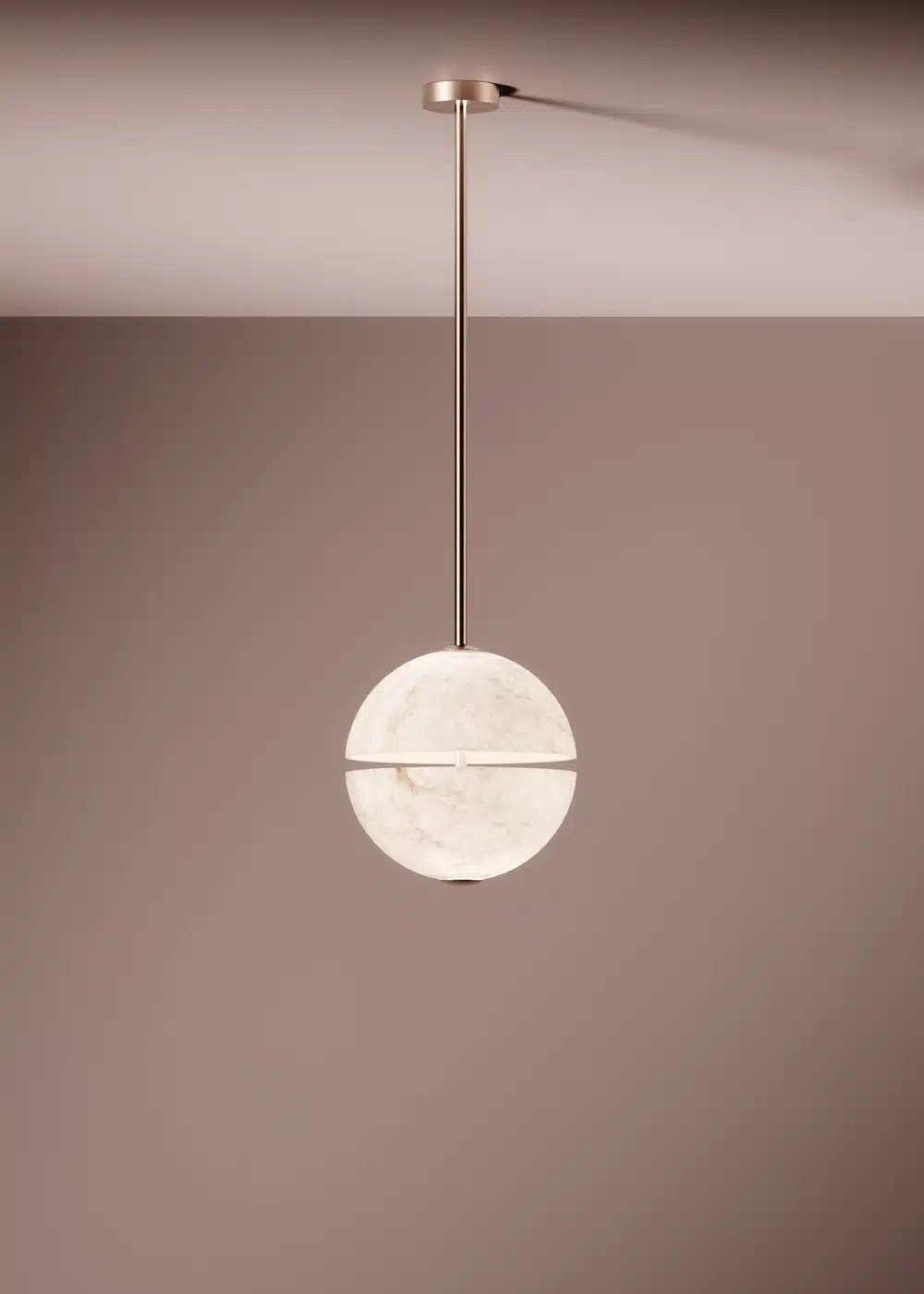 Alabaster domes of varying diameters and tubular elements of varying widths lend dynamism to this exclusive piece, maintaining a perfect balance of style. Named Apollo after the Greek god who pulled the sun chariot, the series draws inspiration from this peculiarity; a metal structure supports a series of luminescent hemispheres.