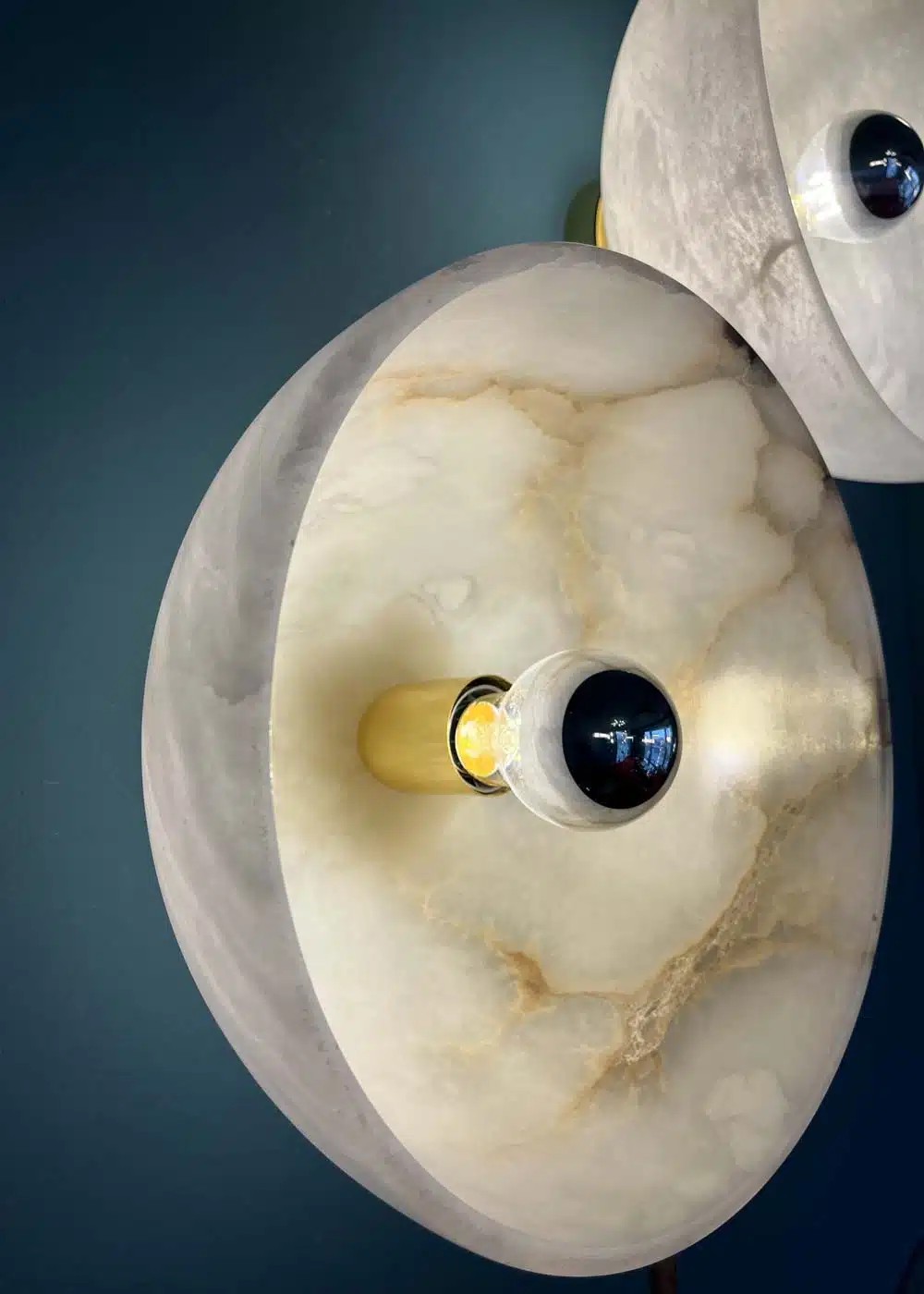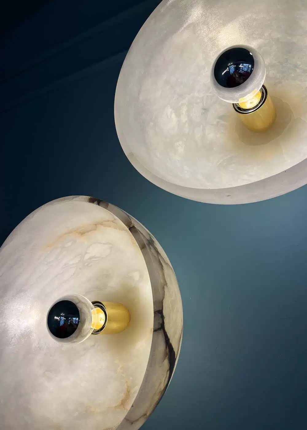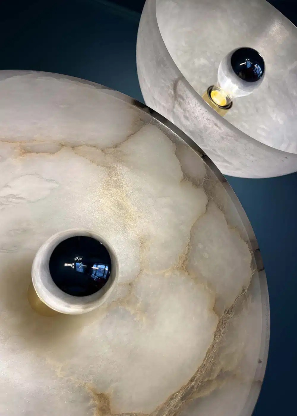 Alabaster domes of varying diameters and tubular elements of varying widths lend dynamism to this exclusive piece, maintaining a perfect balance of style. Named Apollo after the Greek god who pulled the sun chariot, the series draws inspiration from this peculiarity; a metal structure supports a series of luminescent hemispheres.