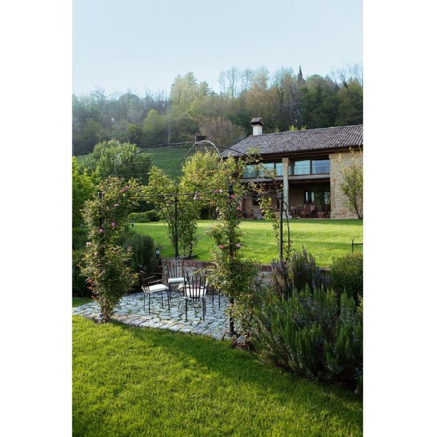 The construction consists of aged brass poles connected by aged brass tubing. The lighting appliance is in aged copper. It comes with all the accessories needed for a simple lawn anchoring, although it can be customized with wood, granite or bricks. The structure can be covered with canopy, climbing plants or Indian drapes. Horizontal dimensions can be adapted to existing or custom designed spaces. Item provided with lighting fixture including bulb.