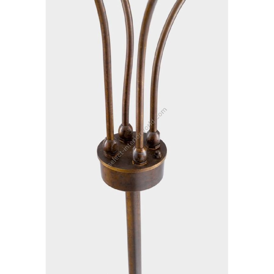 Led powered outdoor floor-lamp with four lights, made from aged brass tubing with aged copper reflectors.