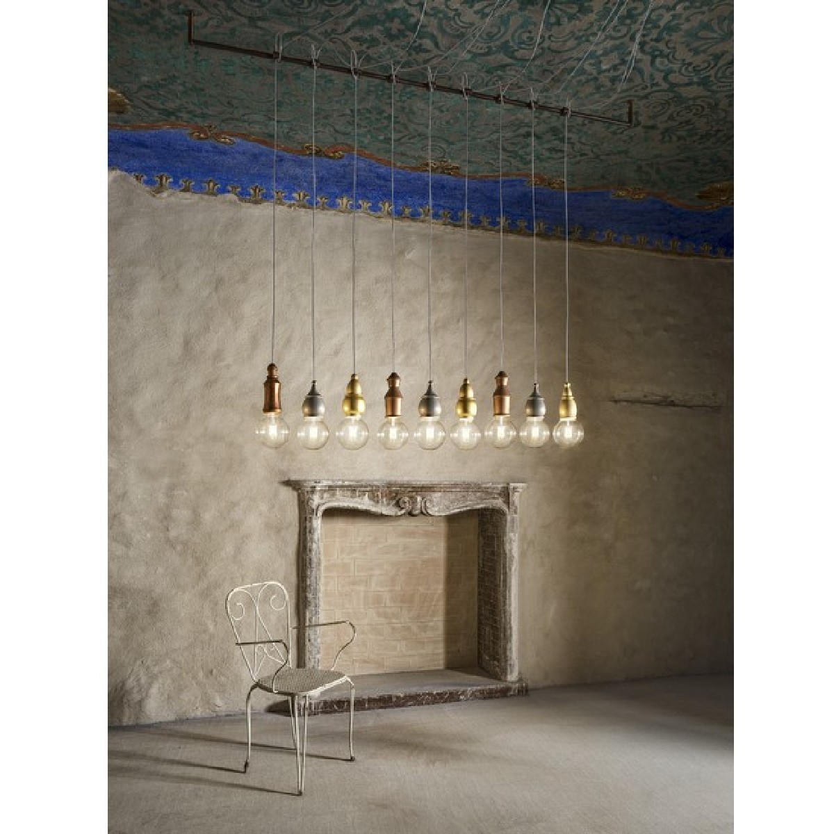 This solution is indicated to create, as desired, a line of pendants, on rigid support in antiqued brass which has standard dimensions 1800 mm. x 115 mm.