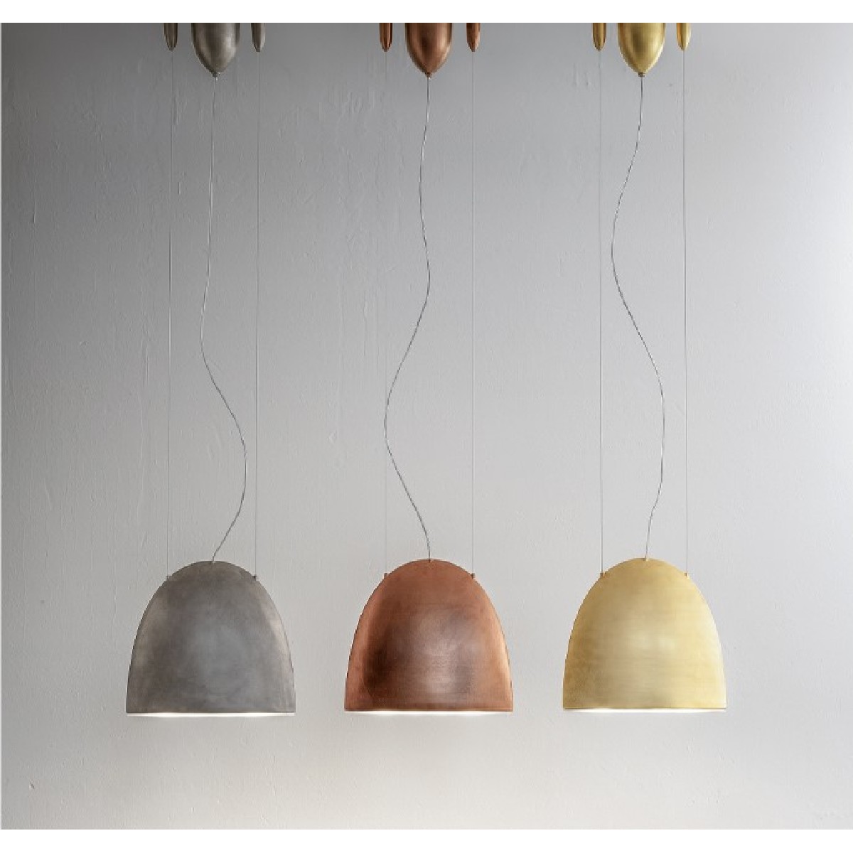 Ceramic pendant with a thin linear shape, predisposed with lateral support cables in stainless steel. The choice of finishes goes from classic ceramic glazes, to ceramic luster using 22-carat gold, 22-carat platinum or copper-90 content, both in the gloss version or in the beautiful matt version. The light is concentrated downwards. SFOGIO, used single or in different combinations, is ideal for lighting tables or those projects that require more concentrated lighting.