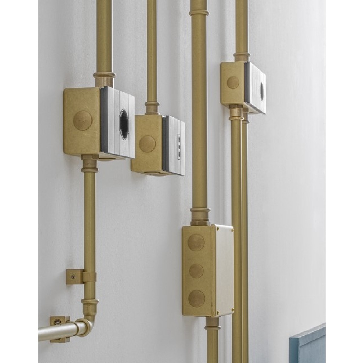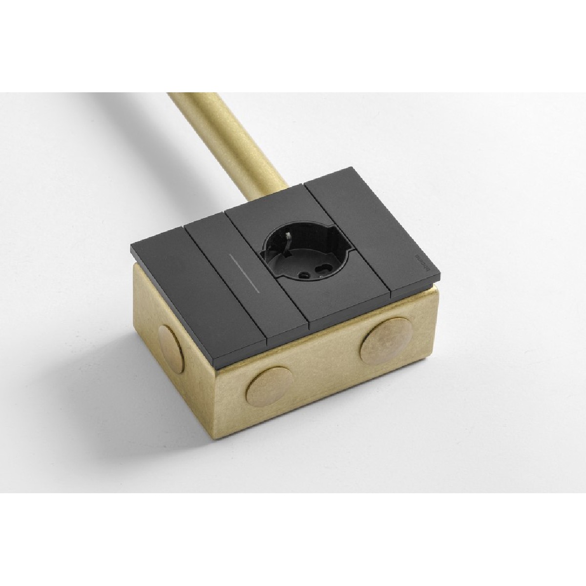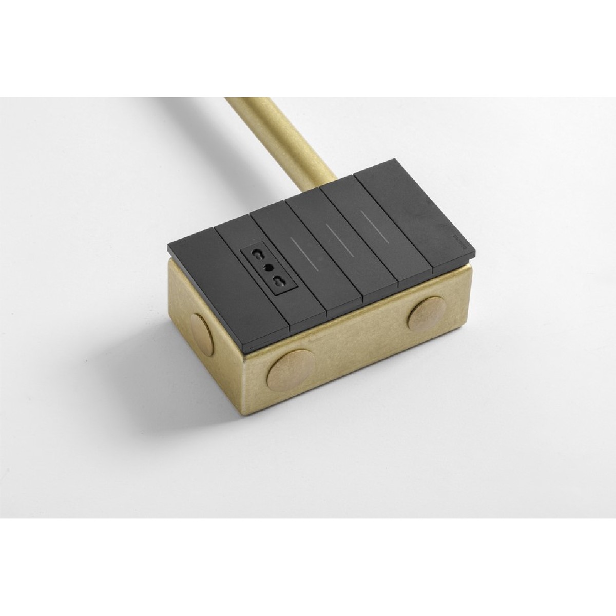 Interesting visible indoor lighting system available in the new finish that Aldo Bernardi offers, the martellato brass, the result of which is a pleasant, opaque and silky appearance of this material. The core of the ECONOW system is a new and interesting model of junction boxes of various sizes.