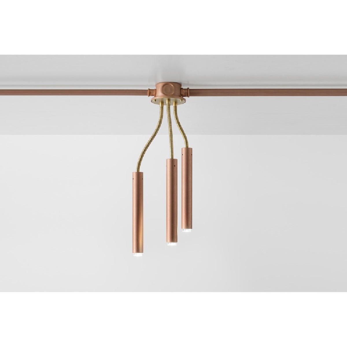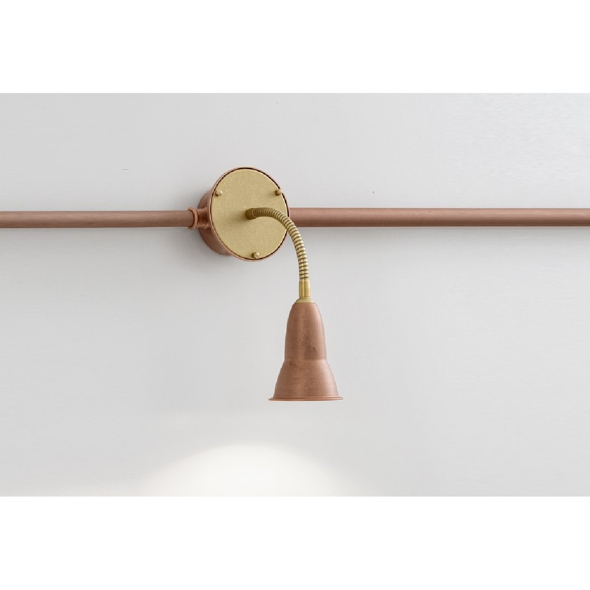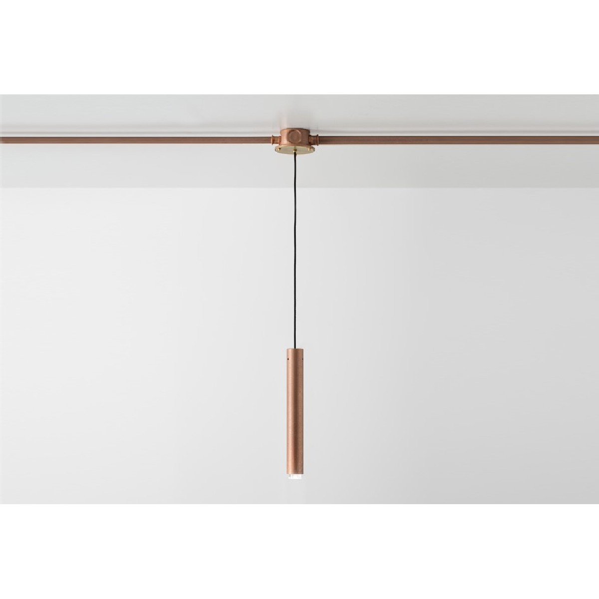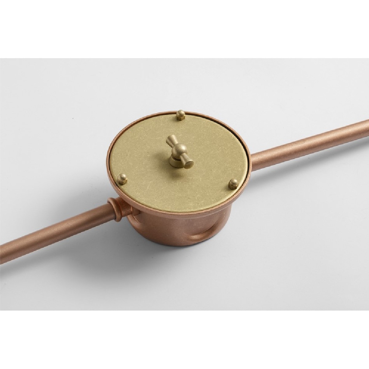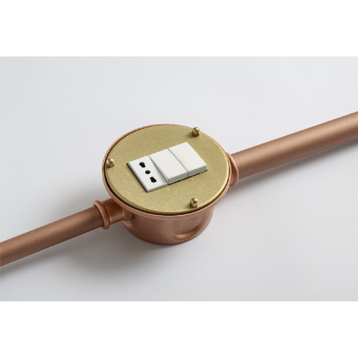 The indoor system present and develop the new finish that Aldo Bernardi defines as martellato copper. It is a completely manual finishing process, the result of which is a pleasant opaque and silky appearance. The fulcrum of the MULTIBOX system is the multi-box item to combine with specific accessories for the construction of a conduits system. The multi-box item has different functions (junction box, switch, rose), and is composed of a brass cover and a copper base available It has 4 outputs for connection with 16.22 or 28 mm. in diameter. When ordering it is necessary to specify which outputs you wish to open and of which diameter. Each MULTIBOX can have different diameter outputs. All fittings, accessories and fixtures to be combined with the MULTIBOX system, are in martellato copper and are to be specified when ordering. The MULTIBOX system can also be combined with our TUBE or CLEMATIDE lines for the creation of lighting points within the system itself. The suspensions can be made with a support cable or with a flexible tube and both are available only in the new martellato copper finish, above mentioned. When ordering, the codes of the items you wish to combine are to be specified.