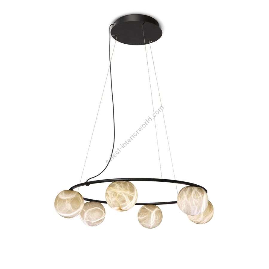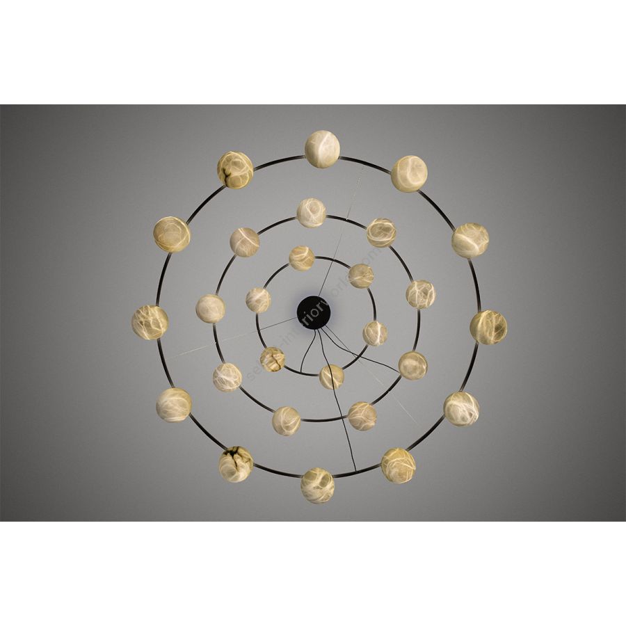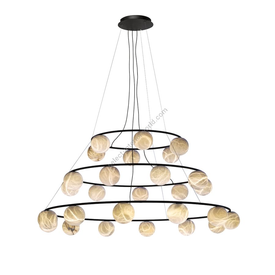 Die Struktur besteht aus strukturiertem, schwarz lackiertem Eisen, das von einem geflochtenen Stahlkabel getragen wird. Die Schirme sind natürliche Alabasterkugeln mit 12 cm Durchmesser. Die Lichtquellen sind integrierte 4,5 W 2700 K 270 lm LEDs, die ein-/ausgeschaltet oder über TRIAC dimmbar geliefert werden können. Der Treiber ist immer im Lieferumfang enthalten und befindet sich im Baldachin.