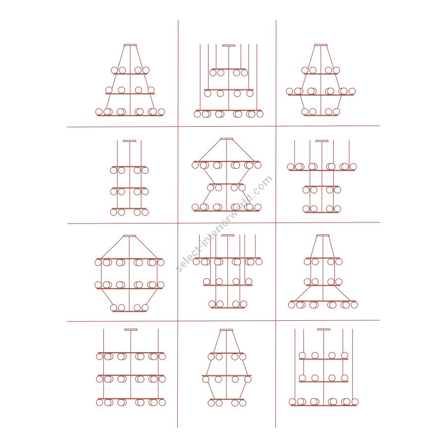 Die Struktur besteht aus strukturiertem, schwarz lackiertem Eisen, das von einem geflochtenen Stahlkabel getragen wird. Die Schirme sind natürliche Alabasterkugeln mit 12 cm Durchmesser. Die Lichtquellen sind integrierte 4,5 W 2700 K 270 lm LEDs, die ein-/ausgeschaltet oder über TRIAC dimmbar geliefert werden können. Der Treiber ist immer im Lieferumfang enthalten und befindet sich im Baldachin.