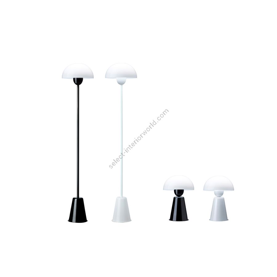 STAR gibt es in zwei Versionen: Tischlampe und Stehlampe. Beide sind in zwei Ausführungen erhältlich: schwarz und weiß glänzend lackiert, wobei der Schirm immer aus weißem Methacrylat und der Fuß aus lackiertem Eisen besteht. Beide Versionen verfügen über einen Dimmer im Schalter entlang des Kabels, der es ermöglicht, die hohe Lichtleistung an die jeweiligen atmosphärischen Bedürfnisse anzupassen. STAR verfügt in allen Fällen über eine E27-Fassung.