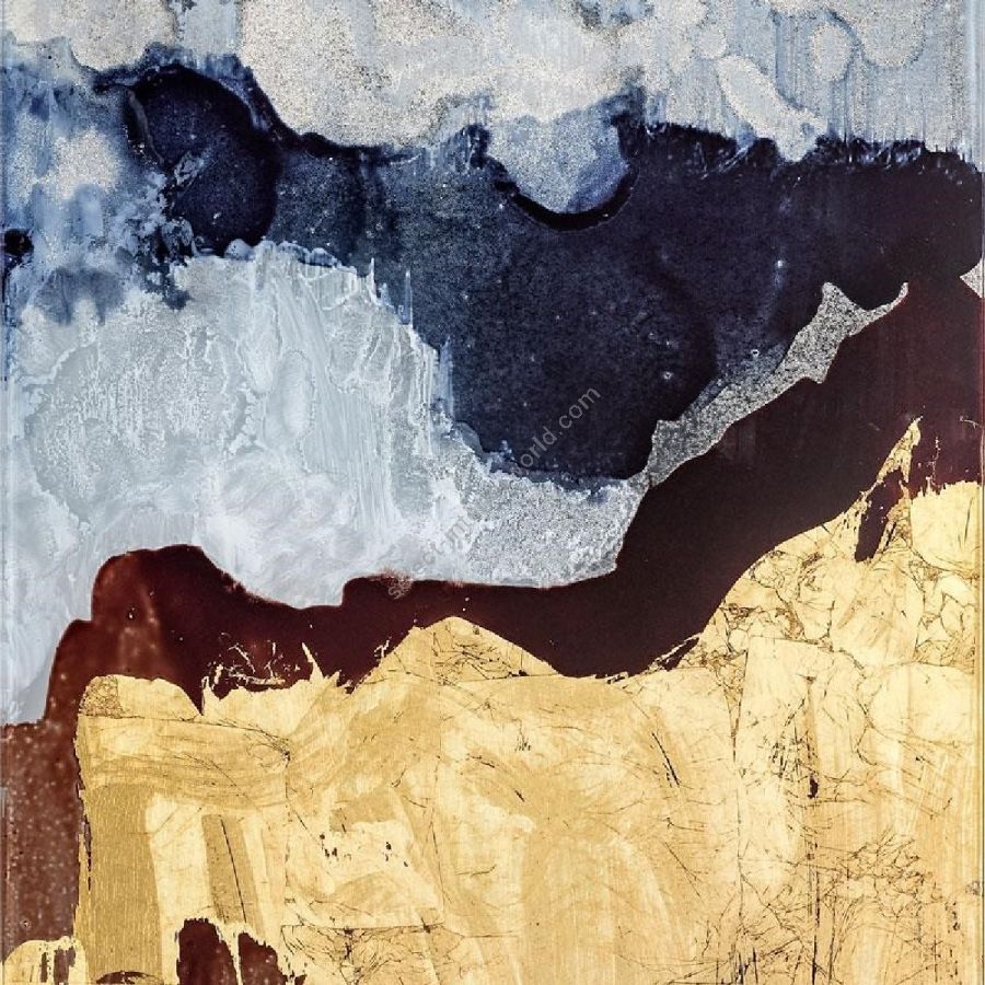 Dekor „Behind Mona Lisa“ mit burgunderroten, hellblauen und dunkelblauen Lacktönen auf einem zerkratzten goldenen Blattmuster.