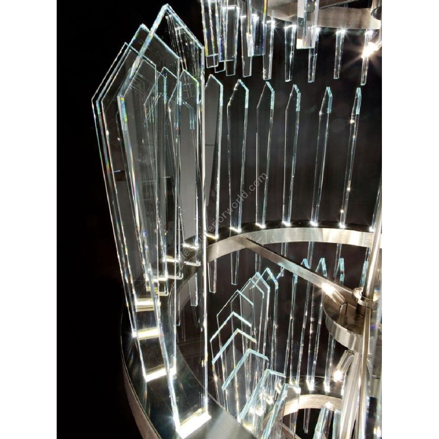 Struktur aus Messing mit satinierter Nickeloberfläche. Handgeschliffene Balken aus extraklarem Glas. LED-Beleuchtung.