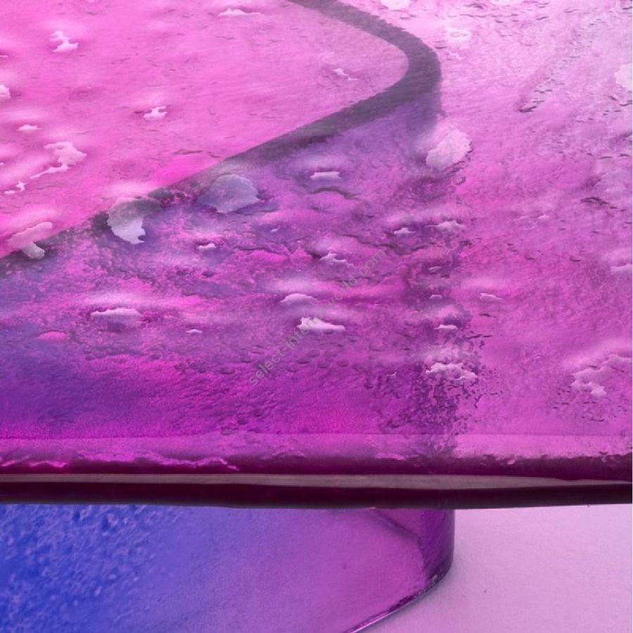 Platte und Beine aus gebranntem Glas in zwei Schichten mit unregelmäßigen Rändern. Das gesamte Stück ist in einer Abstufung von Rosa bis Blau lackiert, mit teilweiser Versilberung auf der Rückseite.