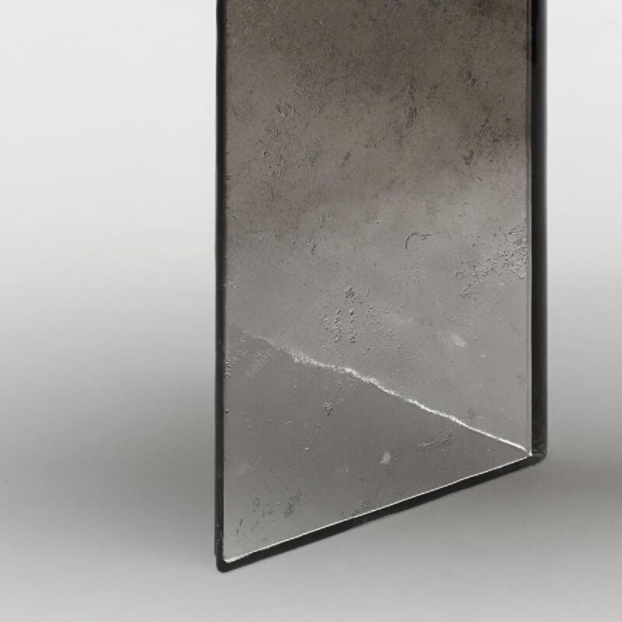 Deckel und Beine aus zwei Schichten gebranntem Glas mit unregelmäßigen Rändern. Alle Dekorationen in Degradé von bleigrau bis transparent, mit teilweiser Versilberung auf der Rückseite.