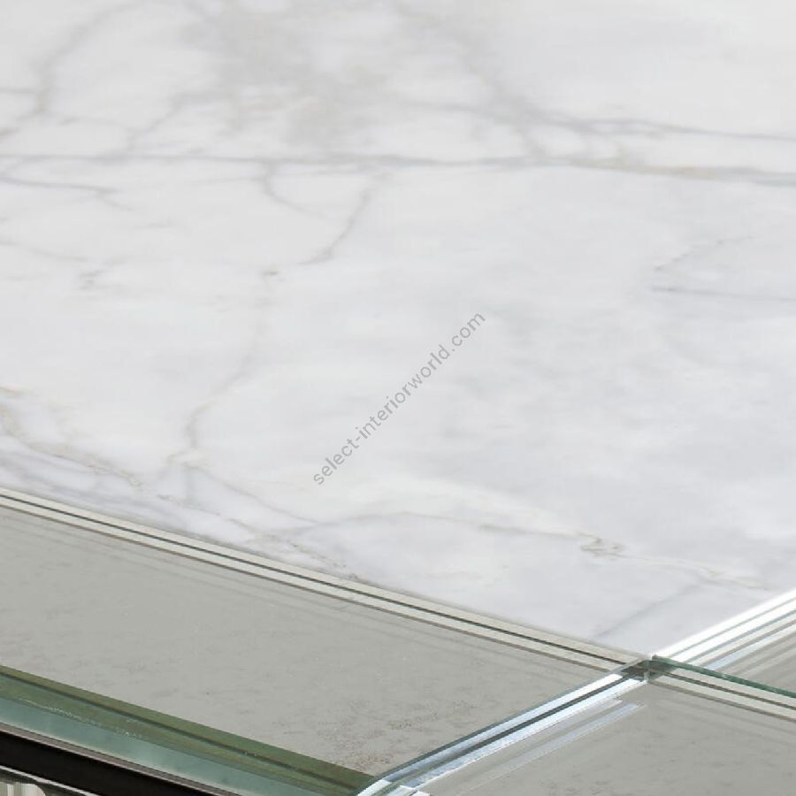 Platte aus weißem Calacatta-Marmor. Rahmen und Beine aus abgeschrägtem und graviertem Glas mit klarer Spiegeloberfläche.