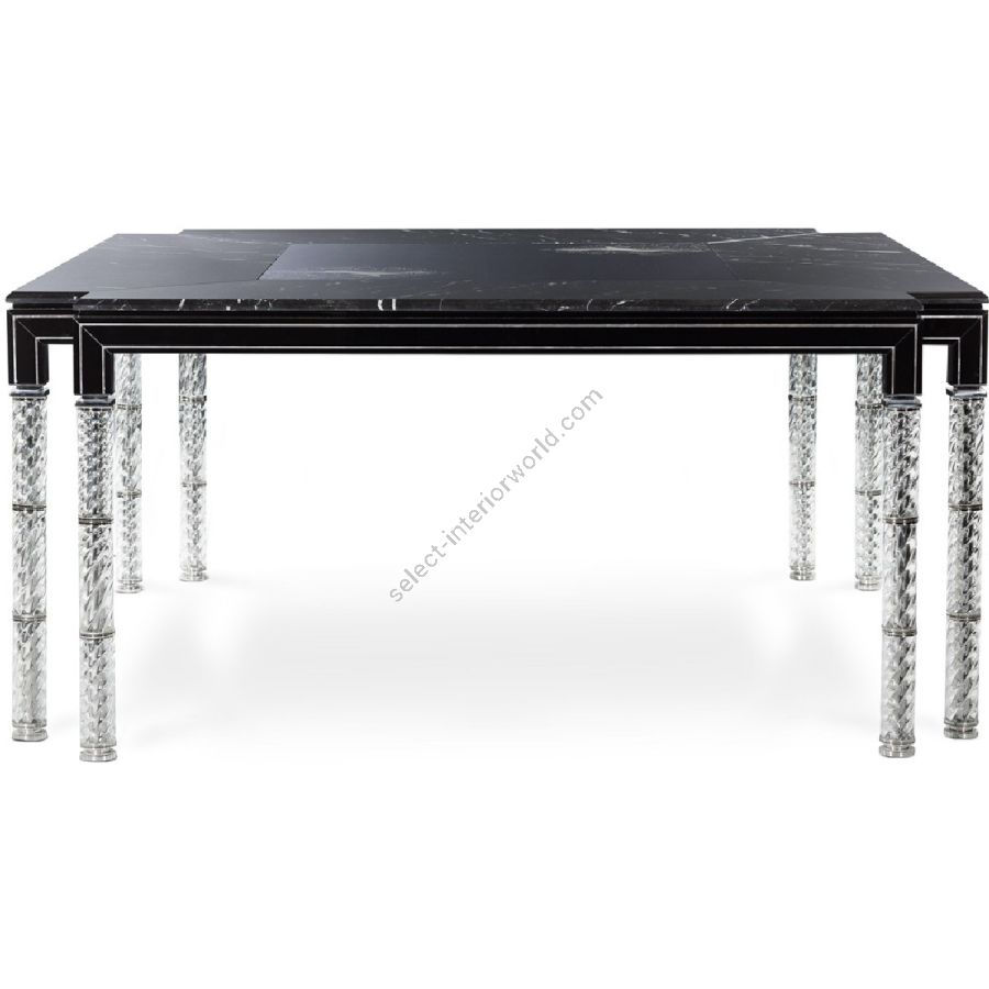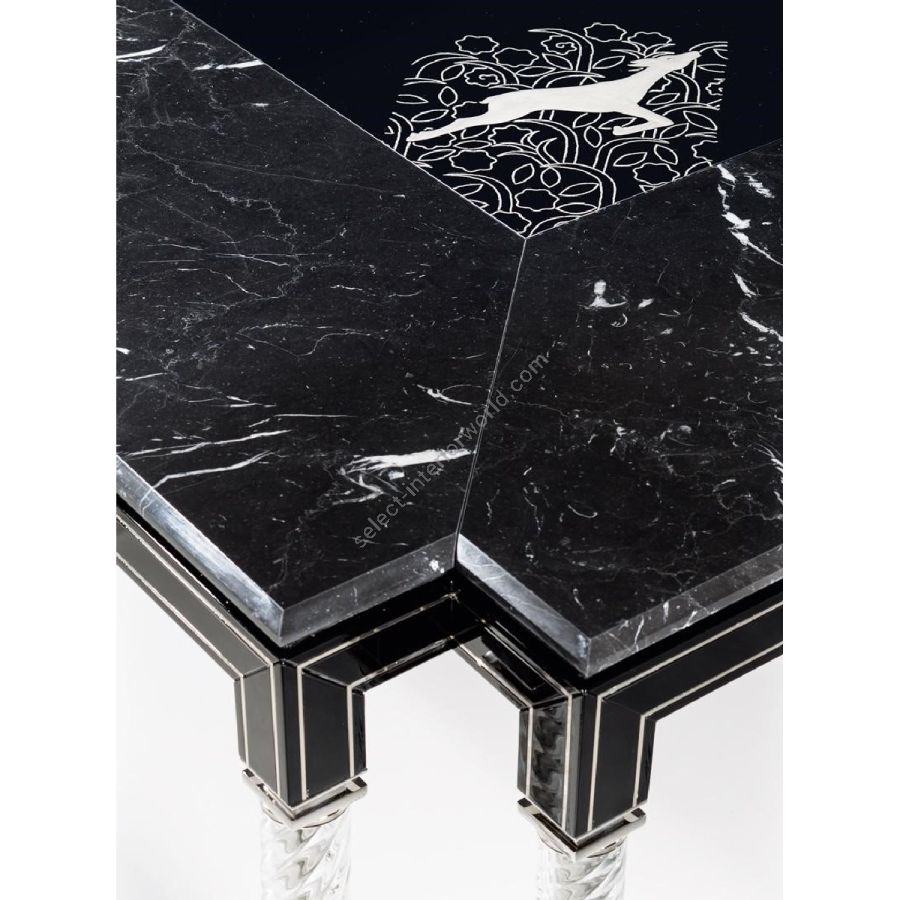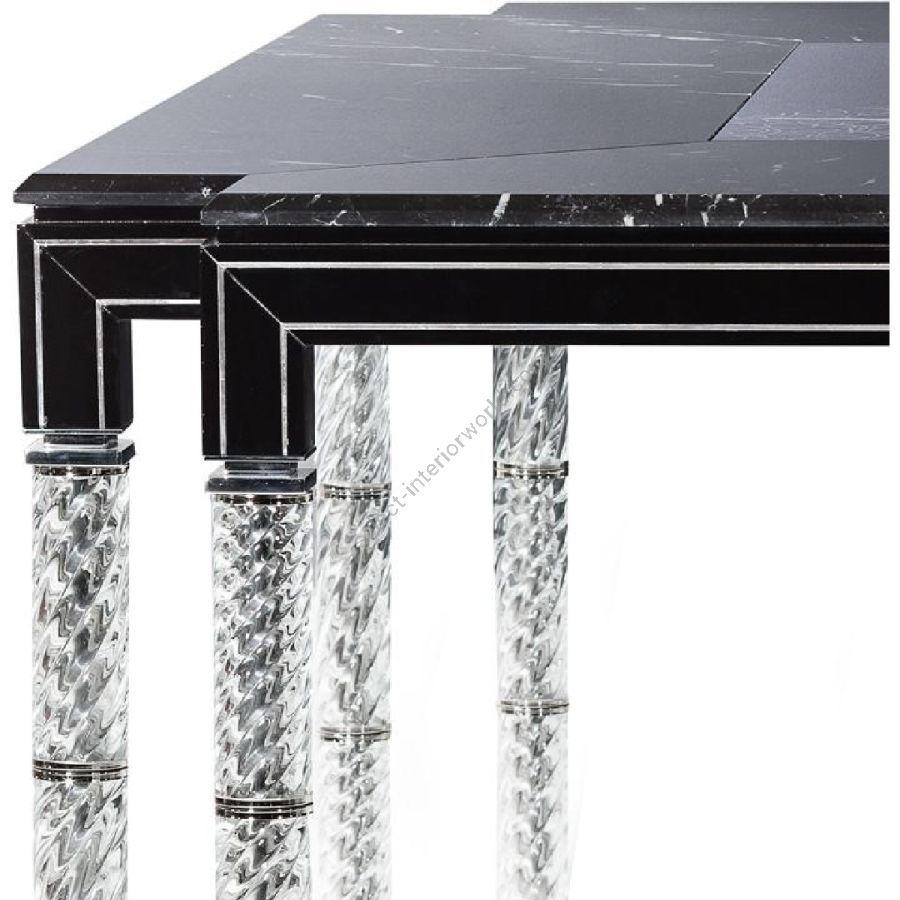 Tisch aus glänzend schwarz lackiertem Holz mit Details aus verchromtem Messing. Platte aus schwarzem Marquina-Marmor und schwarzem Glas mit versilberten Gravuren. Beine aus kristallfarbenem Torchonglas.