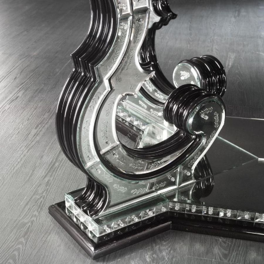 Platte aus schwarzem Marquinia-Marmor. Rahmen und Beine aus abgeschrägten und gravierten Glasfliesen mit mittelalterlicher Spiegelung.