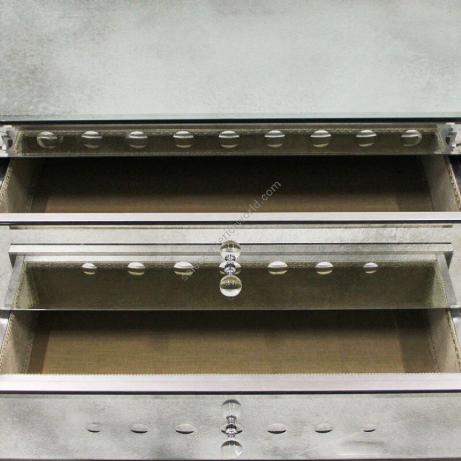 Zwei teilweise ausziehbare Schubladen mit Soft-Close-System und beigem Samt im Inneren. Oberseite, Seiten und Rückwand aus abgeschrägtem Glas mit mittlerer antiker Verspiegelung.