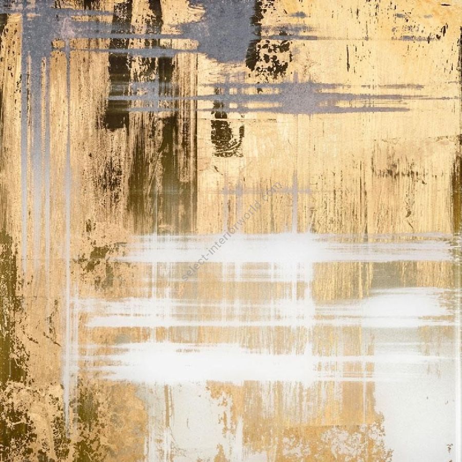 Dekor „Girgenti“ mit weißen und ockerfarbenen Lacktönen auf einem gekratzten Blattgoldmuster.