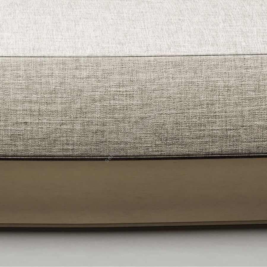 Holzsockel mit einer Verkleidung aus gebürstetem, brüniertem Messing. Rückenlehne und Sitz gepolstert und mit hellgrauem Stoff bezogen.