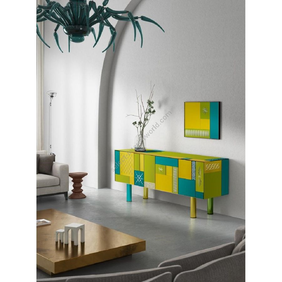 Entdecken Sie das Design von Leo De Carlo in perfekter Harmonie mit der Verarbeitung von extraklarem, säuregeätztem Glas, das mehrfarbig lackiert und mit silbernen Handgravuren verziert ist.