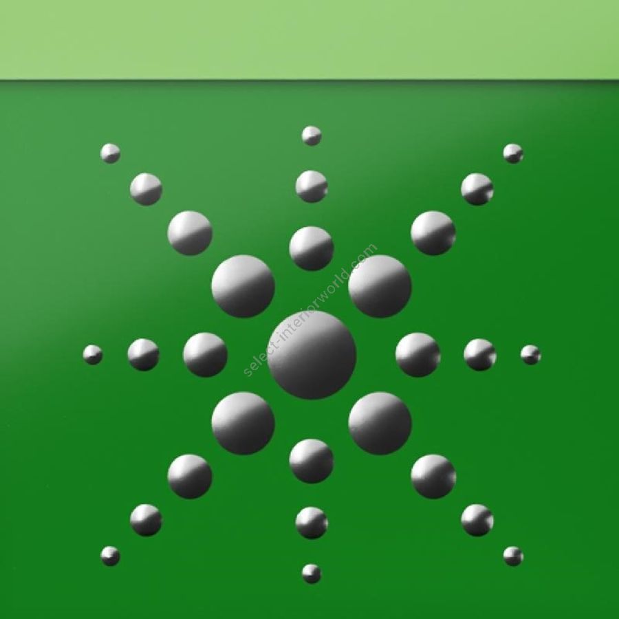 Holzrahmen mit glänzender säuregrüner Lackierung an der Kante. Mehrfarbige, extraklare und lackierte Glasbeschichtung von 6 mm Dicke mit Silberätzung.
