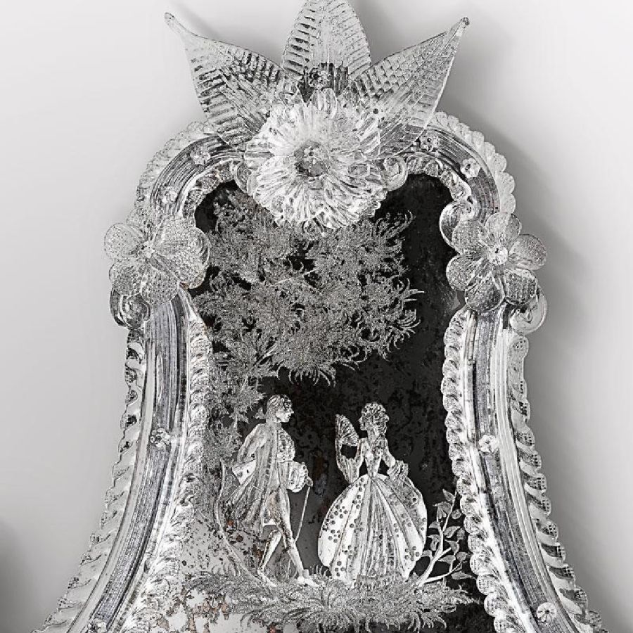 Die berühmtesten Figuren sind die typisch eingravierten Locken und die Darstellung von Bacco, der Gerechtigkeit oder des bekannten venezianischen Achtzehnten Jahrhunderts. Kristallfarbene Murano-Dekorblumen, Blätter, gedrehte Seile und mehrfarbige Rosetten aus Glaspaste verschönern jeden venezianischen Spiegel. Das Ergebnis ist ein einzigartiges Stück, das aufgrund seiner handwerklichen Qualität und seiner hervorragenden Ausführung mit einem Kunstwerk vergleichbar ist.