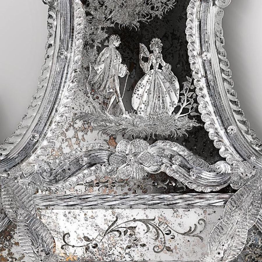 Der Morosini-Spiegel aus dem ist eines der Symbole der Arte Veneziana. Gravuren von floralen Motiven und die Darstellung eines venezianischen Paares, bestehend aus einer Dame und einem Herrn.