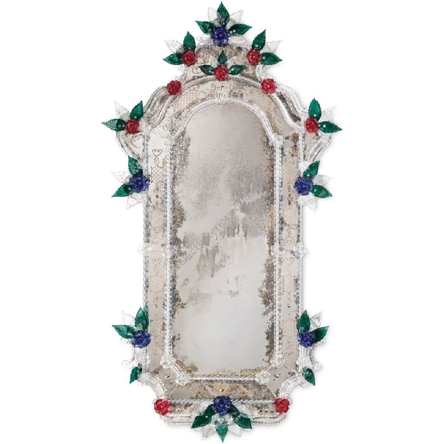 Die berühmtesten Figuren sind die typisch eingravierten Locken und die Darstellung von Bacco, der Gerechtigkeit oder des bekannten venezianischen Achtzehnten Jahrhunderts. Kristallfarbene Murano-Dekorblumen, Blätter, gedrehte Seile und mehrfarbige Rosetten aus Glaspaste verschönern jeden venezianischen Spiegel. Das Ergebnis ist ein einzigartiges Stück, das aufgrund seiner handwerklichen Qualität und seiner hervorragenden Ausführung mit einem Kunstwerk vergleichbar ist.