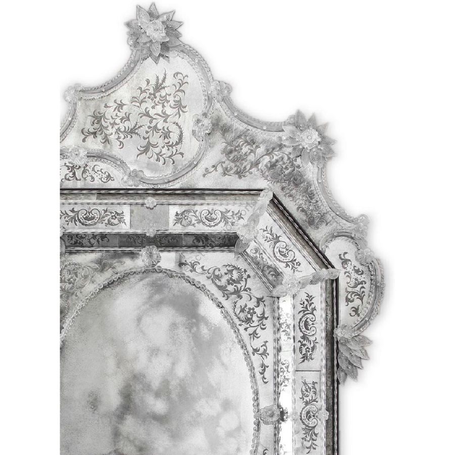 Die berühmtesten Figuren sind die typisch eingravierten Locken und die Darstellung von Bacco, der Gerechtigkeit oder des bekannten venezianischen Achtzehnten Jahrhunderts. Kristallfarbene Murano-Dekorblumen, Blätter, gedrehte Seile und mehrfarbige Rosetten aus Glaspaste verschönern jeden venezianischen Spiegel. Das Ergebnis ist ein einzigartiges Stück, das aufgrund seiner handwerklichen Qualität und seiner hervorragenden Ausführung mit einem Kunstwerk vergleichbar ist.