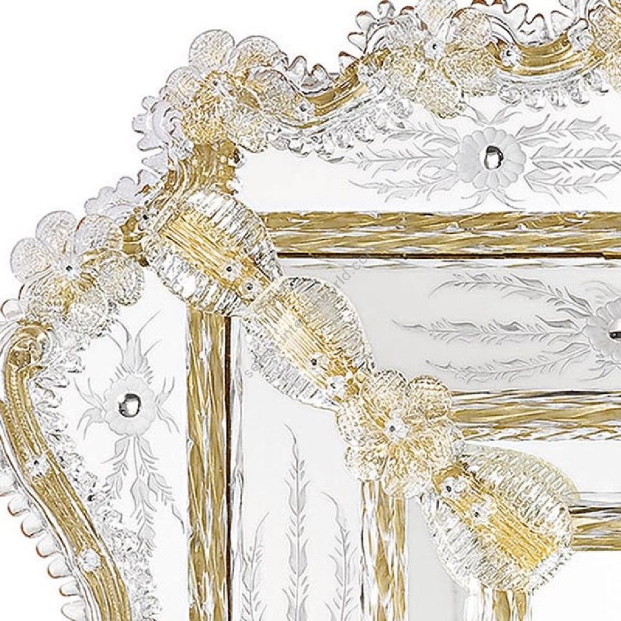 Die berühmtesten Zeichen sind die typischen eingravierten Locken, die Darstellung von Bacco, der Gerechtigkeit oder die bekannten venezianischen Figuren aus dem achtzehnten Jahrhundert. Kristallfarbene Murano-Dekorblumen, Blätter, gedrehte Seile und mehrfarbige Rosetten aus Glaspaste verschönern jeden venezianischen Spiegel. Das Ergebnis ist ein einzigartiges Stück, das aufgrund seiner handwerklichen Qualität und seiner hervorragenden Ausführung mit einem Kunstwerk vergleichbar ist.