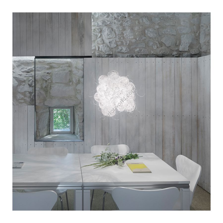 Arturo Álvarez führt mit dieser Kollektion Stahlfäden in sein Materialrepertoire ein. Indem er sie immer wieder verwebt, erschafft er Sphären, die er später zu ätherischen, schnell transparenten Volumen zusammenfügt; Bereitstellung des Designs einer subtilen Schönheit. Sein weißes Finish erhöht die Zartheit eines Stücks, das aus einem kalten Material wie Stahl hergestellt wurde, das nun voller Leben zu erblühen scheint.