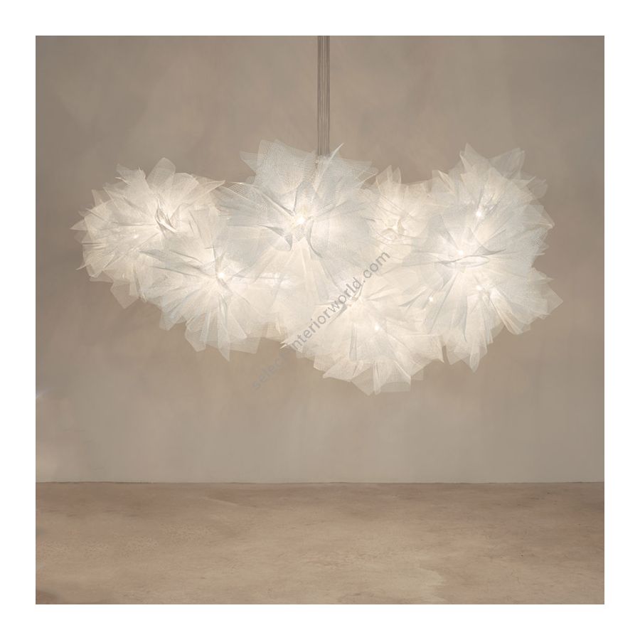 Diese Kollektion von Pendelleuchten besteht aus verzinkten, lackierten Stahlgeflechtschleier, die sich anmutig um einen einzigen Lichtpunkt sammeln. Eine leichte Form, die die Illusion eines hauchdünnen Stoffes reproduziert, wie ein halbtransparenter Tüll, der gleichzeitig enthüllt und verbirgt und mit der Intuition des Betrachters spielt. Die Leichtigkeit dieses Designs, das 2009 mit dem Good Design Award ausgezeichnet wurde, wird in den größten Kronleuchtern der Kollektion verstärkt.