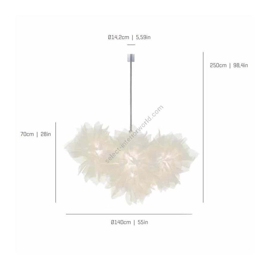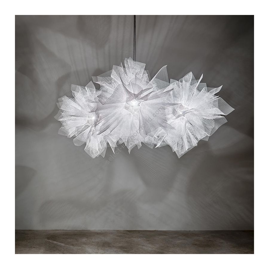 Diese Kollektion von Pendelleuchten besteht aus verzinktem, lackiertem Stahlgeflecht, das sich anmutig um einen einzigen Lichtpunkt sammelt. Eine leichte Form, die die Illusion eines hauchdünnen Gewebes reproduziert, wie ein halbtransparenter Tüll, der gleichzeitig enthüllt und verbirgt und mit der Intuition des Betrachters spielt. Die Leichtigkeit dieses Designs, das 2009 mit einem Good Design Award ausgezeichnet wurde, wird in den größten Kronleuchtern der Kollektion noch verstärkt.