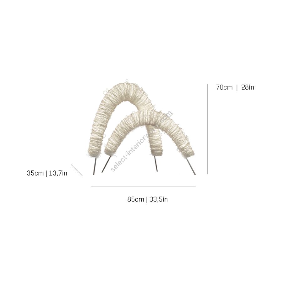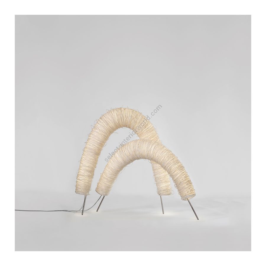 Inspiriert von den wunderschönen Bögen von Santiago de Compostela ist diese Kollektion eine persönliche Hommage an die alten Handwerksmeister der Stadt. Die Stücke bestehen aus zwei gekreuzten Bögen, die ihr riesiges architektonisches Volumen mit der Glätte der japanischen Schnur kontrastieren, die sie umhüllt. Das LED-Licht, das sie von einer Seite zur anderen durchläuft, bleibt gleichmäßig und elegant ausgeblendet und erzeugt authentische Lichtskulpturen.