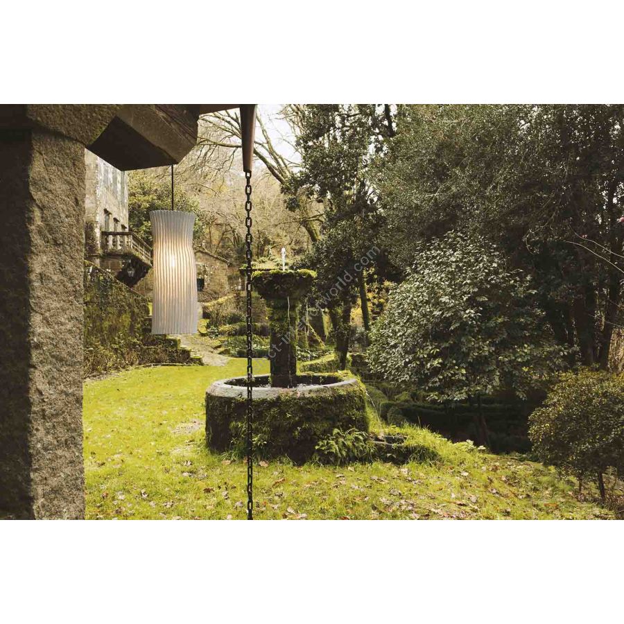 Die Gea-Kollektion hat ihren Namen von der Urgöttin Mutter Erde. Die stilisierten Leuchten, aus denen es besteht, ähneln aufrechten weiblichen Figuren, die sich der Vertikalität widersetzen und in einem gerippten Schleier aus lackiertem Edelstahlgewebe gehüllt sind.