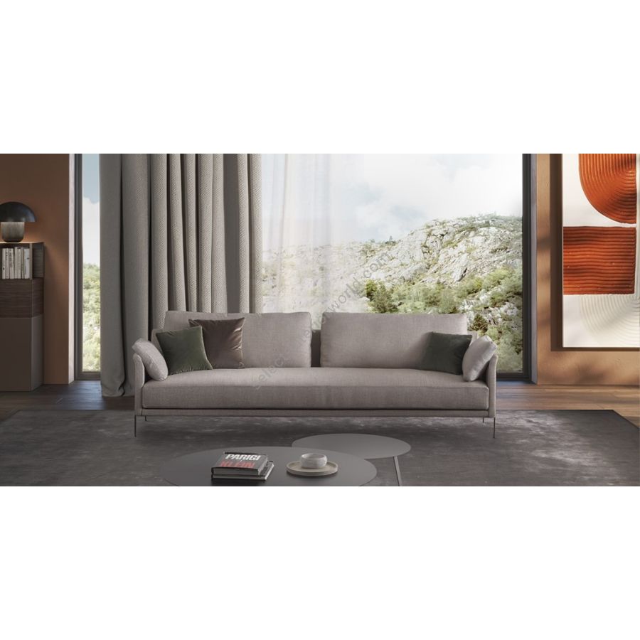 Babila consists of central and terminal elements, which come together sinuously to make even more new settings and combinations. It is characterized by a light air shell, lined with inviting cushions enhanced with hand made stitching, and by the choice of apparently slender but strongly structured foot.