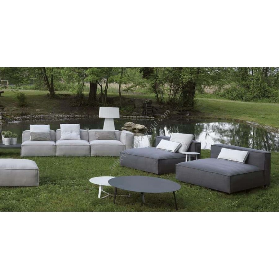 Elements in different sizes with a water-repellent monocoque structure, which can be linked together using a special coupling that allows multiple compositions to be combined, also giving the possibility of separating the backrests and armrests from the bases to change the composition idea at any time.