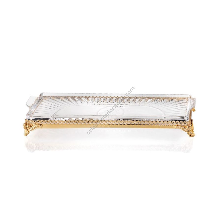 Tablett aus handgeschliffenem italienischem Kristallglas (Pb24%) mit einer Gravur in mattem Rosa. Die Basis ist mit klassischen Messingverzierungen und 24-karätigem Goldfinish versehen. Funktionale Elemente, die ein äußerst elegantes, einladendes und hochwertiges Badezimmer schaffen.