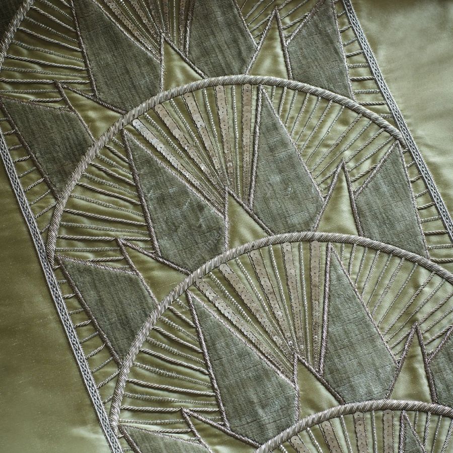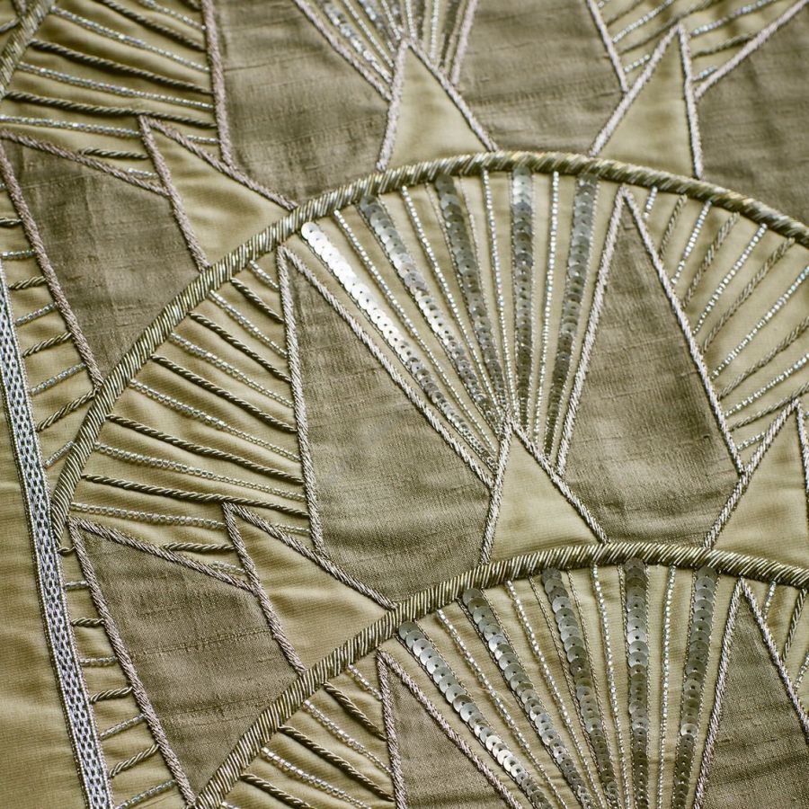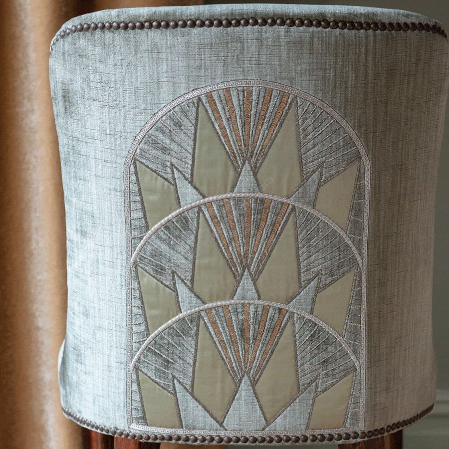 Inspiriert von der Art-déco-Ära und der Skyline von New York ist Rockefeller ein auffälliges Bordürendesign, das mit Metallfäden bestickt ist und auf dem ein kontrastierender Applikationsstoff aus Seide oder Samt angebracht ist.