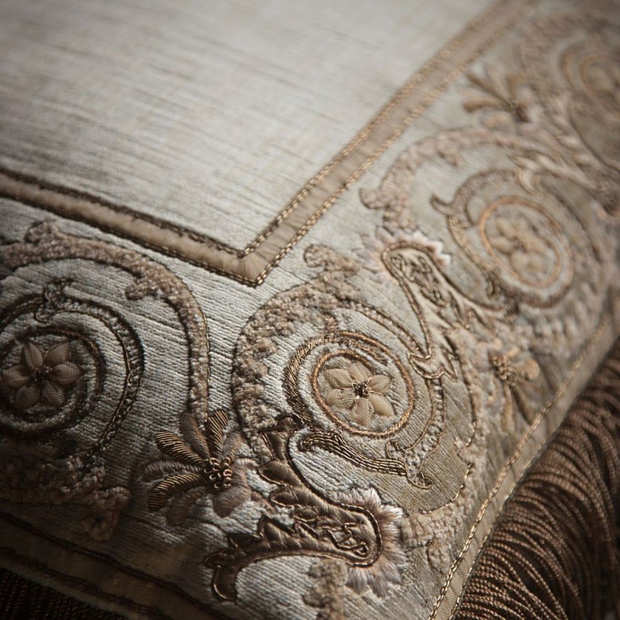Durch die Kombination aufwendiger Techniken mit Goldfäden, Chenille und goldenen Lederapplikationen entsteht dieses klassische und äußerst elegante Design.