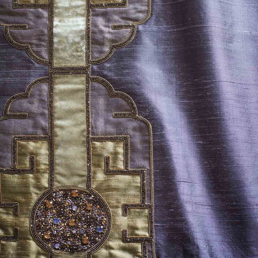 Benannt nach dem Marlow-Stück über den asiatischen Kaiser Timur. Dies ist ein majestätisches und aufwendiges Design, das ein beeindruckendes, selbstbewusstes Statement mit einer Eleganz abgibt, die nur durch den Ausdruck von Handstickerei erreicht werden kann.