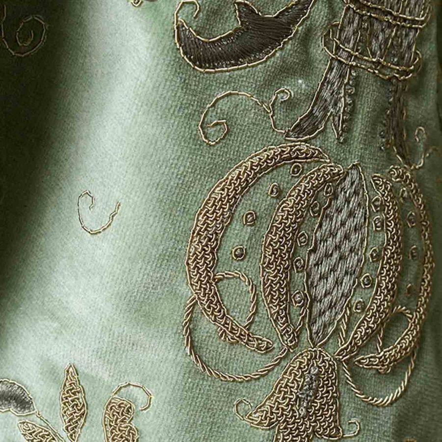 Unsere Couture-Stoffe werden individuell angefertigt und auf Bestellung von Hand bestickt. Sie können mit feinem Gold- oder Silberseidenfaden gefertigt und mit Süßwasserperlen und Halbedelsteinen verziert werden. Jedes Muster kann individuell gefärbt und gestaltet werden. Wir sticken auf alle Grundstoffe, darunter Seide, Samt, Organza und Leder.