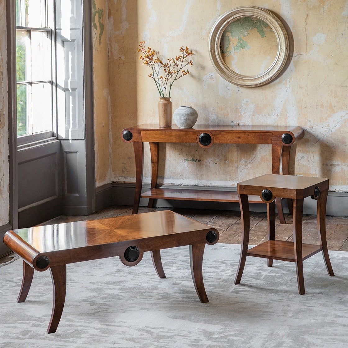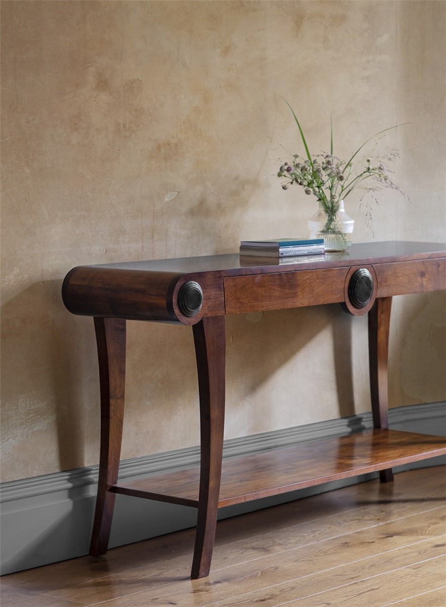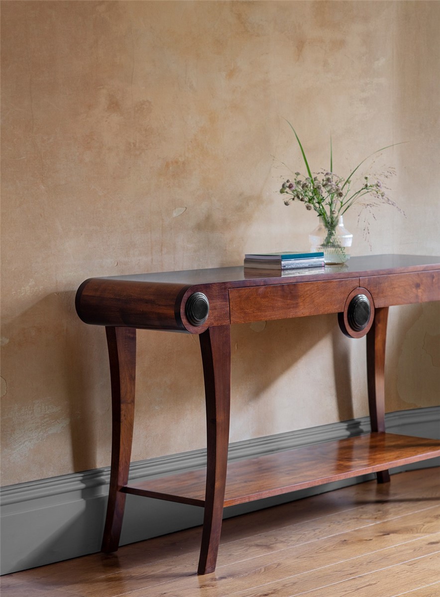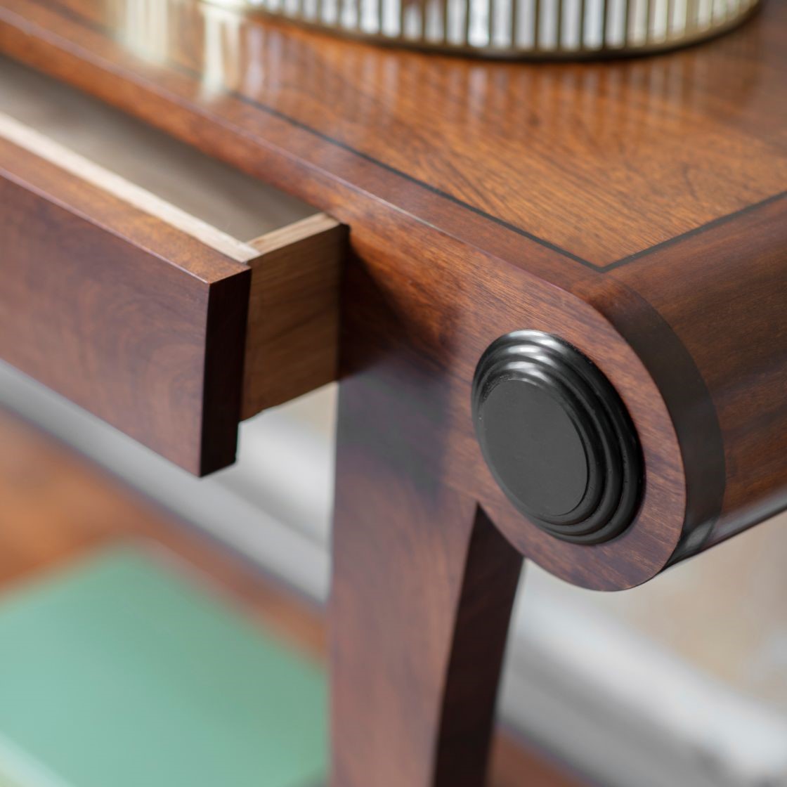 Crafted from solid walnut, the  Art Deco inspired Duke console table is an example of fine English furniture at its very best. The graceful legs and exceptional finish deliver a statement piece for any setting.