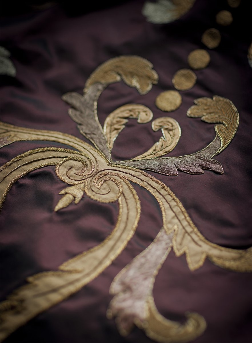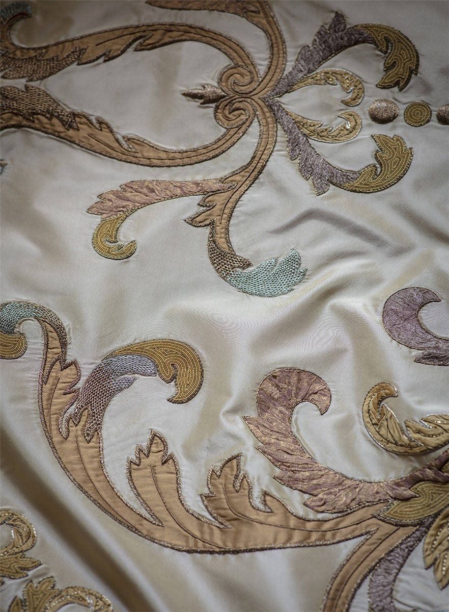 Rondine is an opulent fabric with a distinct regal quality. It comprises elegant Rococo scrolls in silk applique and antiqued gold wire.