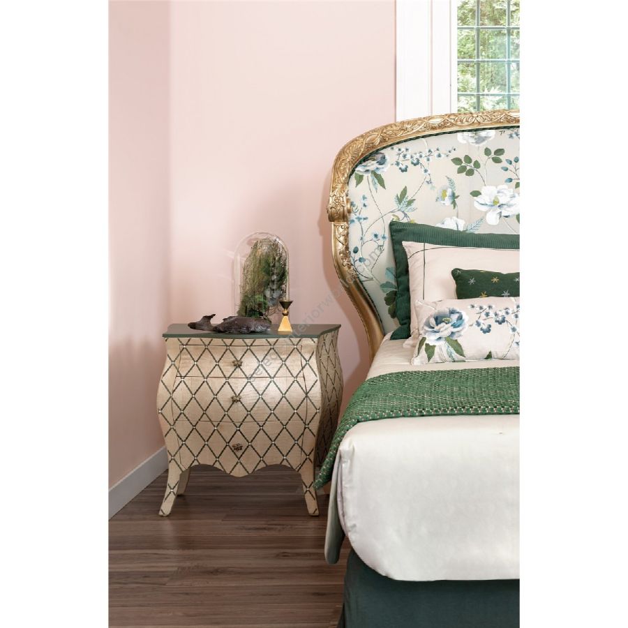Das Schlafzimmer wird zu einer Oase der Ruhe – ein „Wintergarten“ im eigenen Zuhause, der zum Entspannen und Auftanken einlädt. Im Mittelpunkt steht ein Bett mit gesticktem Kopfteil, sanft geschwungen wie eine Umarmung. Ergänzt wird das Ensemble durch Nachttische und eine Kommode, gefertigt aus hellem, naturfarbenem Holz, mit rückseitig lackierten Glasplatten und edlen Perlmutt-Rauteneinlagen. Dieser Nachttisch ist mit Ahorn-Frisé furniert und besitzt filigrane Perlmutt-Intarsien sowie ein Rautenprofil aus Tay-Furnier. Die lackierte Glasplatte in Grün Lotus setzt einen eleganten Akzent, während dekorative Messinggriffe für eine luxuriöse Note sorgen. Entworfen vom Bellotti Ezio Team, verbindet dieses Möbelstück stilvolle Ästhetik mit meisterhafter Handwerkskunst.