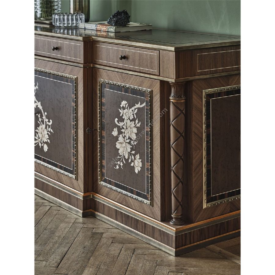 Ein neues florales Intarsienmuster zieht sich wie ein roter Faden durch den Tisch, das Sideboard und die Vitrine im Esszimmer. Dieses Motiv wurde aus einem Stück Stickerei entnommen, das in einem historischen Dokument im Archiv eines Londoner Museums zu finden ist. Die lebendigen Mandarintonfarben und die besonderen bronzierten Lackierungen kommen in den Oberflächen des umliegenden Mobiliars, einschließlich Sideboards, zur Geltung und betonen die zarten Schnitzereien im Massivholz. Das Sideboard verfügt über vier Türen, die mit Canaletto-Walnuss, Erable, Ebenholz und Ahorn eingelegt sind, mit Profilen, die mit bronziertem Lack verziert sind. Dekorative Säulen in poliertem Canaletto-Walnuss und lackiertem Mandarinenlack vervollständigen das Stück und schaffen eine elegante, raffinierte Ergänzung für jeden Raum.