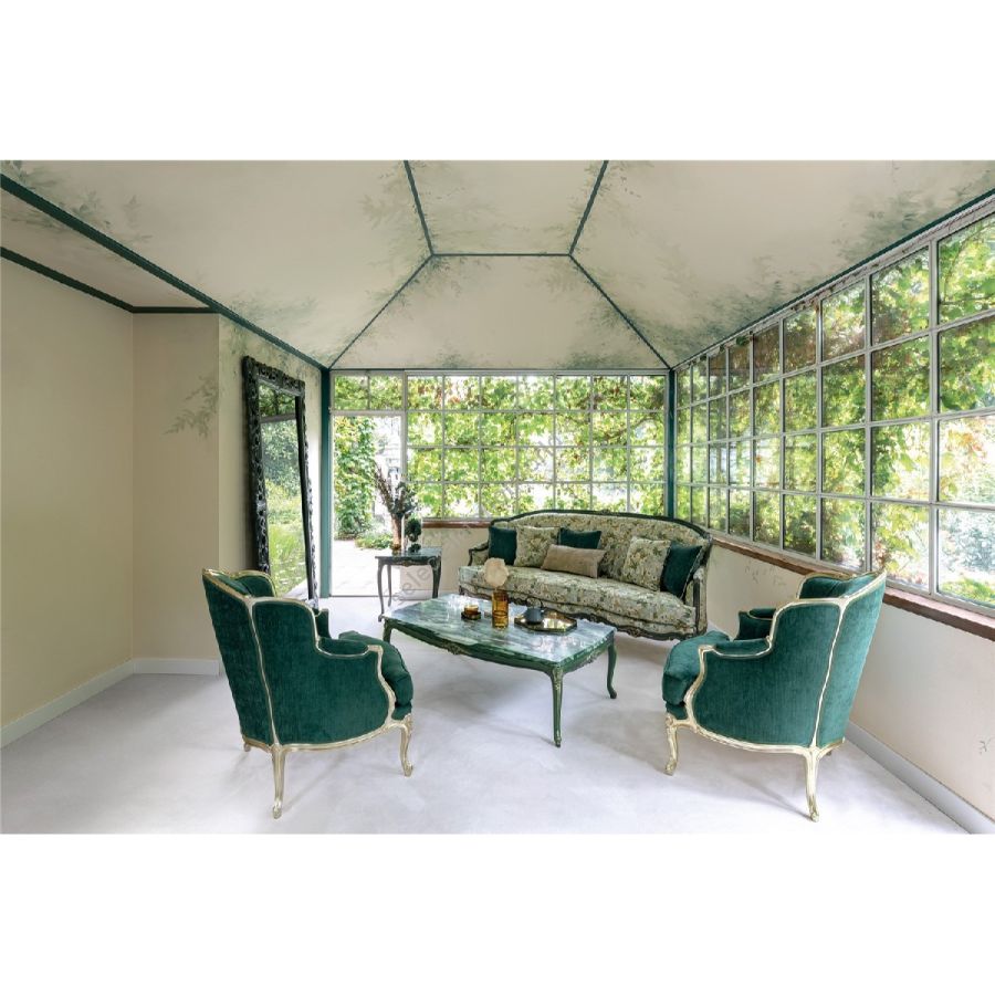 Ein Raum, in dem die Eleganz von Lotusgrün im Mittelpunkt steht. Dieses edle dreisitzige Sofa, bezogen mit luxuriösem Stoff, fügt sich harmonisch in das Ambiente ein, begleitet von farblich abgestimmten Sesseln und einem prächtigen Marmorcouchtisch. Der sanfte Grünton mildert die opulente Louis XV-Ästhetik und schafft eine Atmosphäre zeitloser Eleganz.