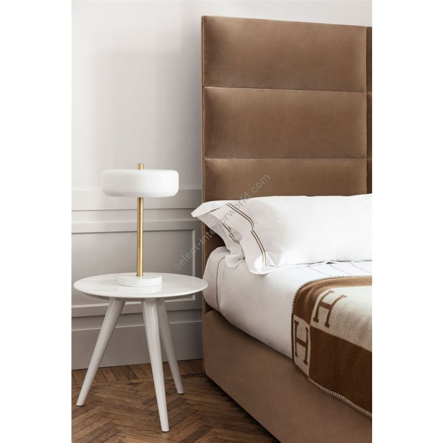 The upholstered headboard or boiserie, and the box spring base, on which the mattress lies, are available in a wide range of fabrics.